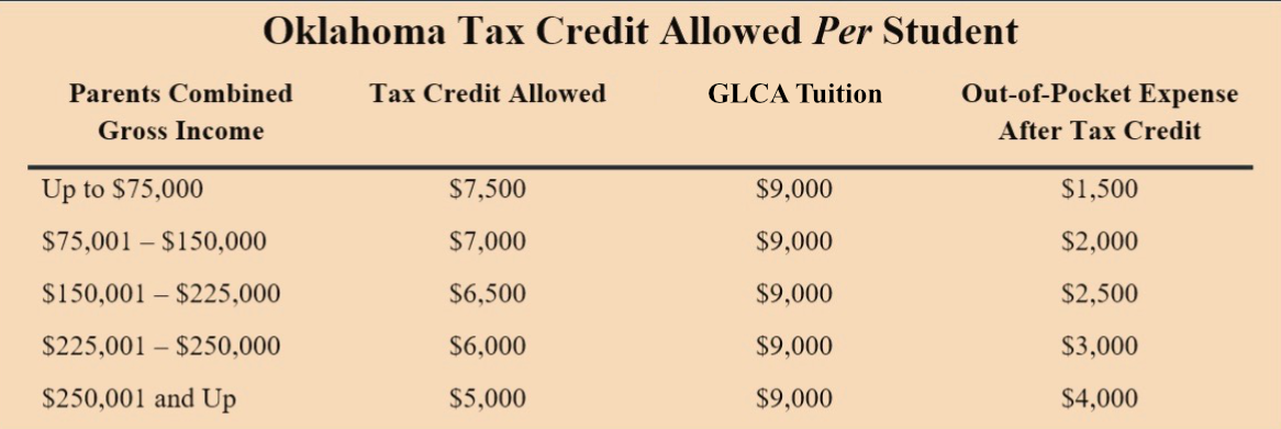 NOTE: FOR ANY FAMILIES WHO ARE NON-RESIDENTS OF OKLAHOMA OR WHO DO NOT QUALIFY FOR THE OKLAHOMA PARENTAL CHOICE TAX CREDIT, GLCA TUITION ASSISTANCE VOUCHERS ARE AVAILABLE IN THE SAME AMOUNTS AS THE PCTC FOR ENROLLEES OF GLCA. PLEASE INQUIRE WITH MRS T FOR ADDITIONAL INFORMATION.
